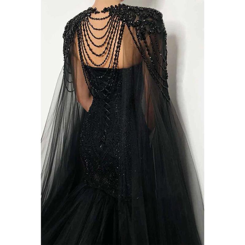 Robe de soirée sirène noire sexy à col en V profond et perles avec traîne