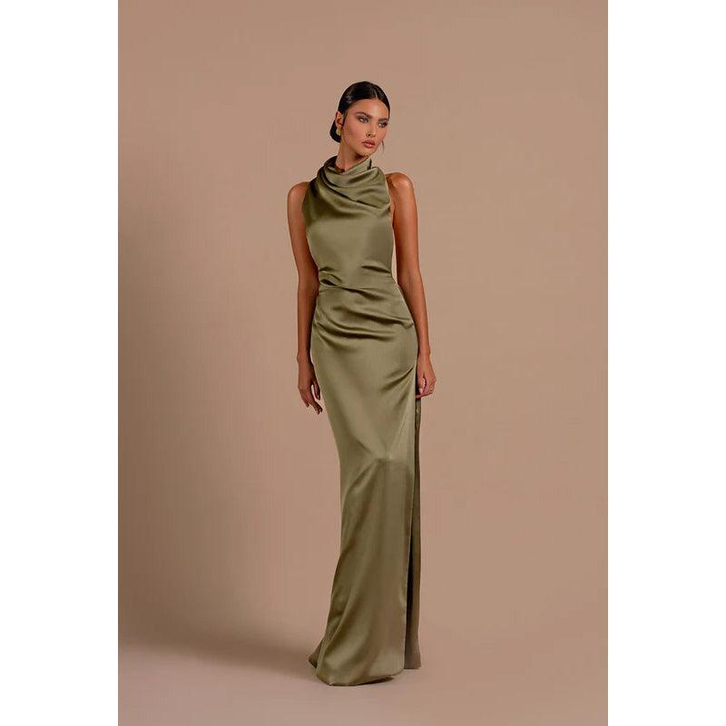 Robe de soirée longue fourreau sexy en satin dos nu avec fente latérale