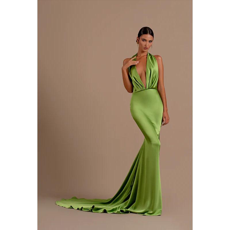 Robe de soirée longue sirène en satin froncé, décolleté en V profond et dos nu