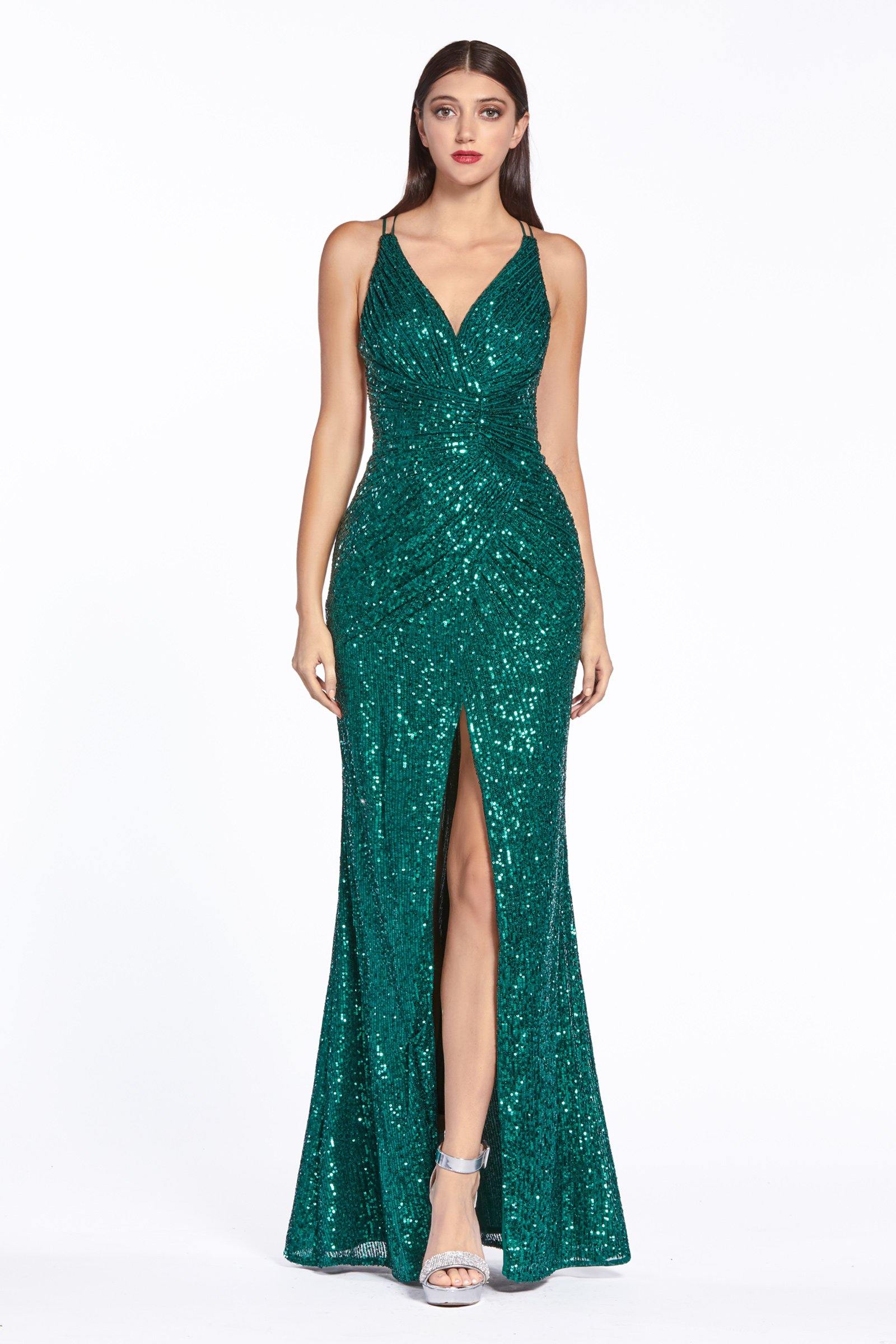 Cette robe longue moulante à fines bretelles et sequins, ornée de sequins, présente un décolleté en V, une taille froncée, un dos nu à bretelles croisées et une fente sur le côté. Parfaite pour une soirée habillée ou toute autre occasion spéciale.