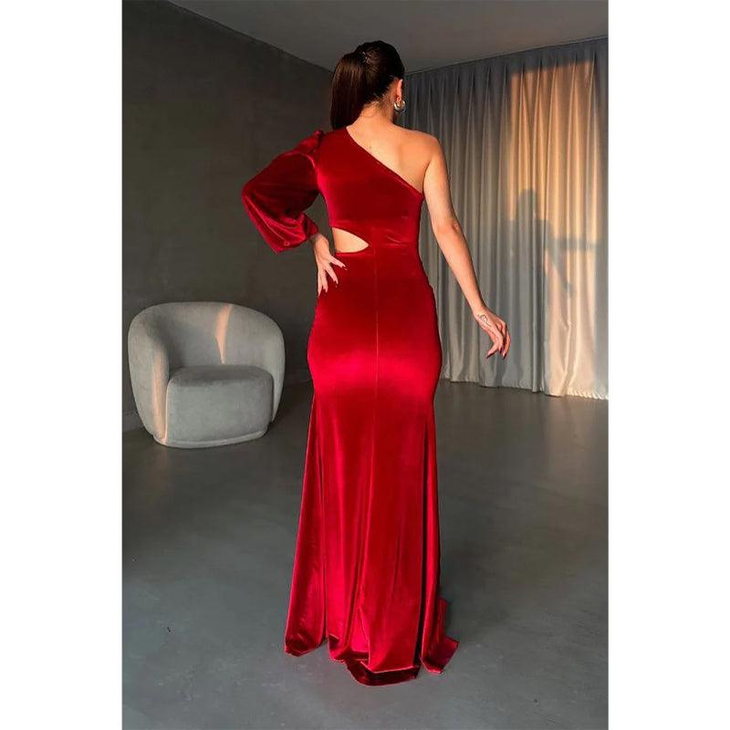 Robe de soirée longue en velours bordeaux, fourreau/colonne, asymétrique