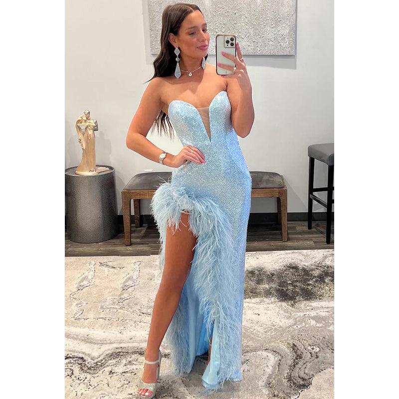 Robe de soirée fourreau/colonne à col en V et paillettes, sans manches, à plumes