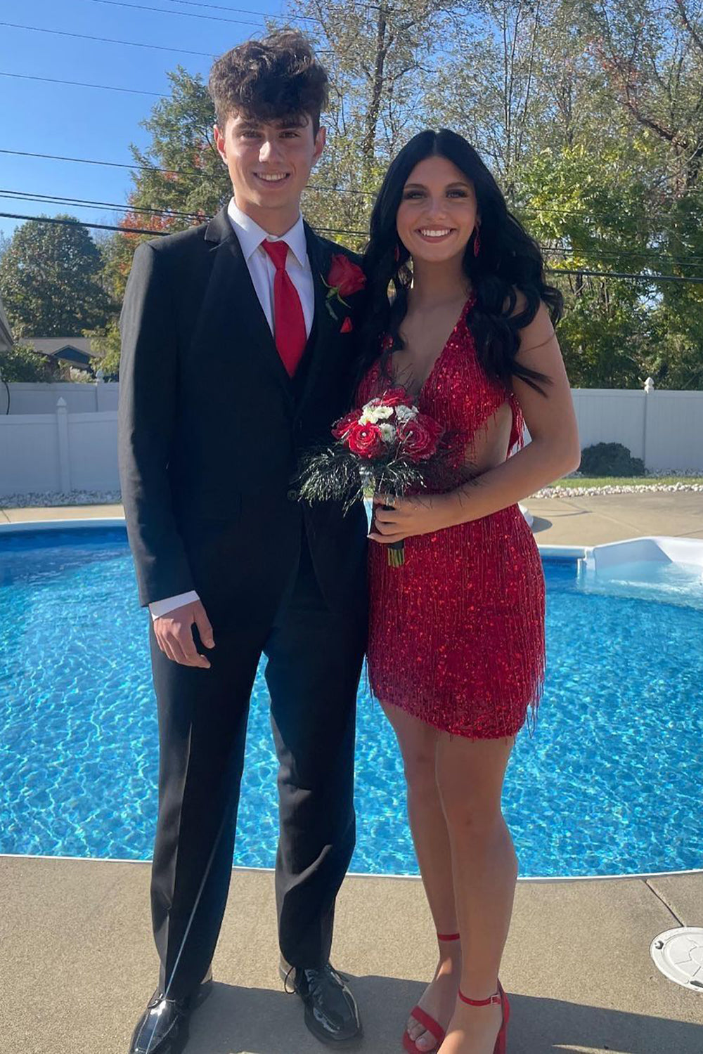 Robe fourreau rouge courte à col V profond et pompons pour le bal de promo