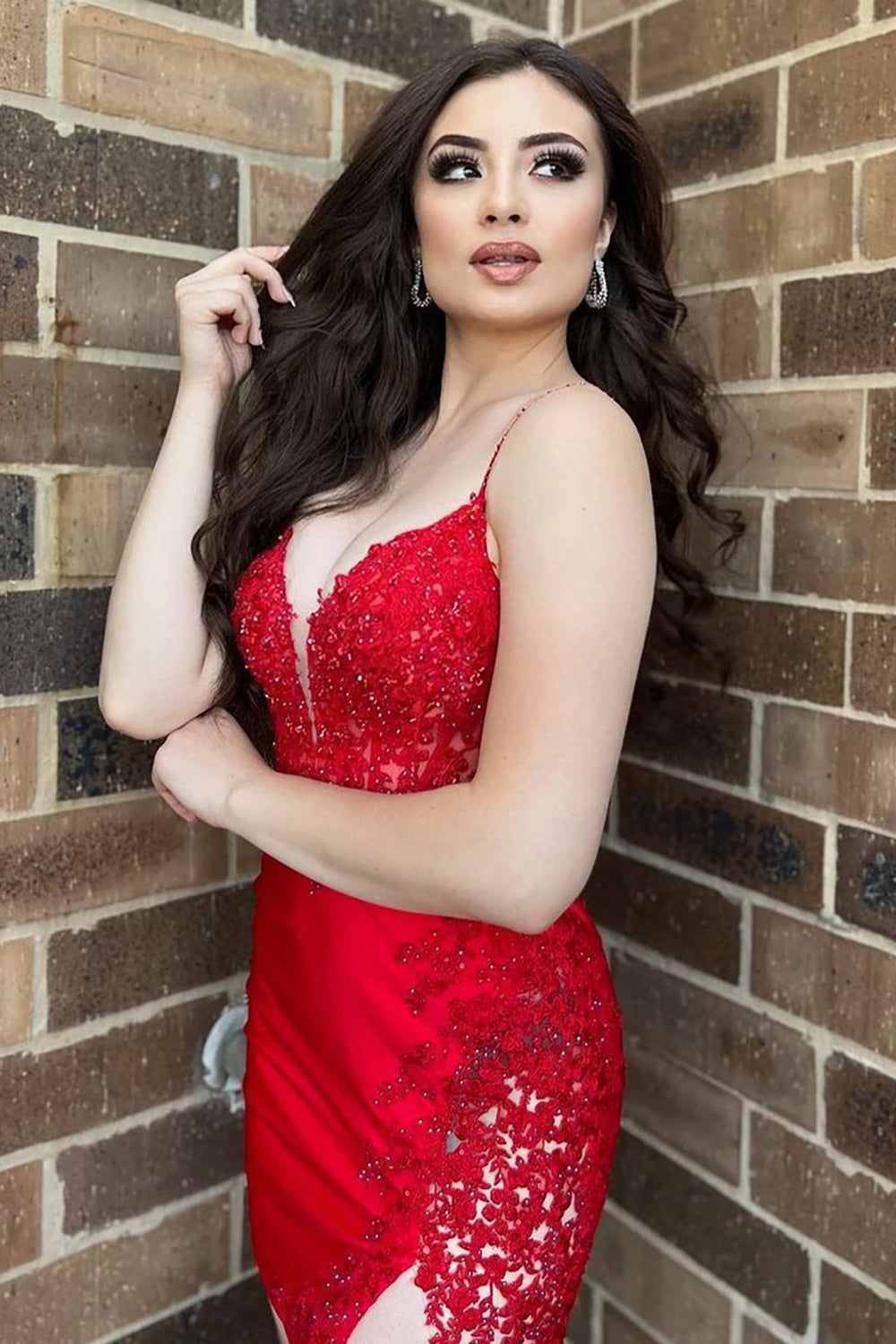 Robe de bal courte rouge fourreau à fines bretelles et appliques