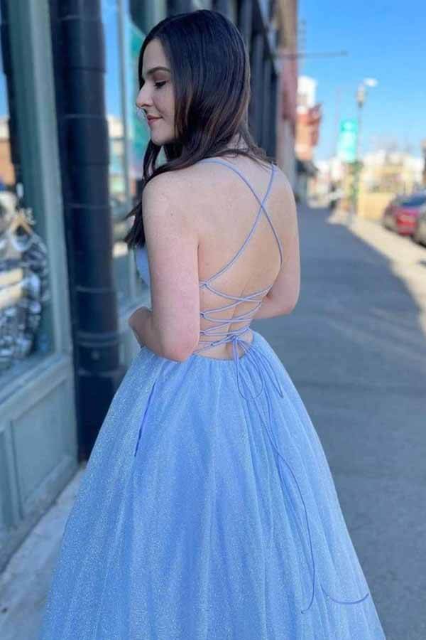 1. Tissu : Tulle brillant 2. Silhouette : Ligne A 3. Encolure : Col en V 4. Ornementation : Aucune 5. Tour de taille : Naturel 6. Manches : Sans manches 7. Styles de dos : à lacets 8. Longueur de l'ourlet : Longueur au sol 9. Osseux : Oui 10. Entièrement doublé : Oui 11. Soutien-gorge intégré : Oui 12. Couleur de l'image : Bleu/Rose (Pour les couleurs personnalisées, veuillez consulter notre nuancier et laisser une note)