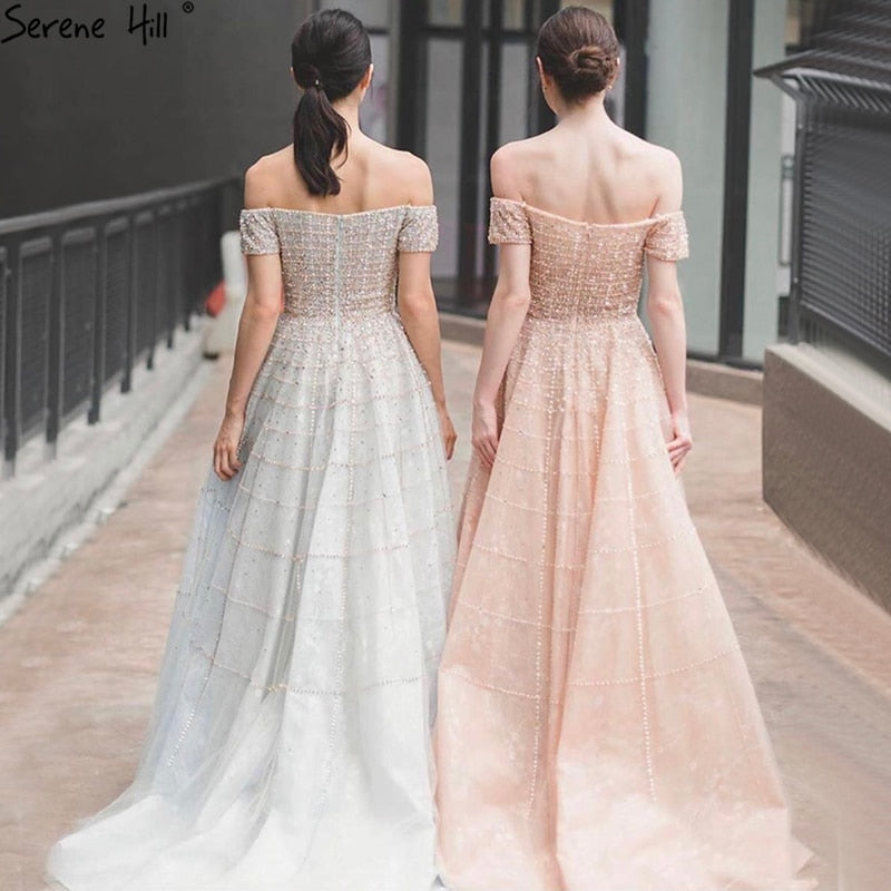 Robe de soirée argentée à épaules dénudées et manches courtes, style A-Line, perles et diamants, Dubaï, LA70263, 2025