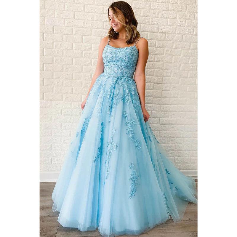 Robe de bal longue trapèze en tulle bleu ciel avec appliques