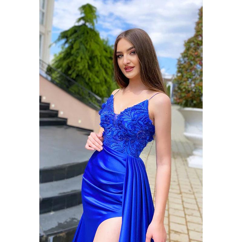 Robe de soirée longue en satin froncé à bretelles spaghetti et col en V