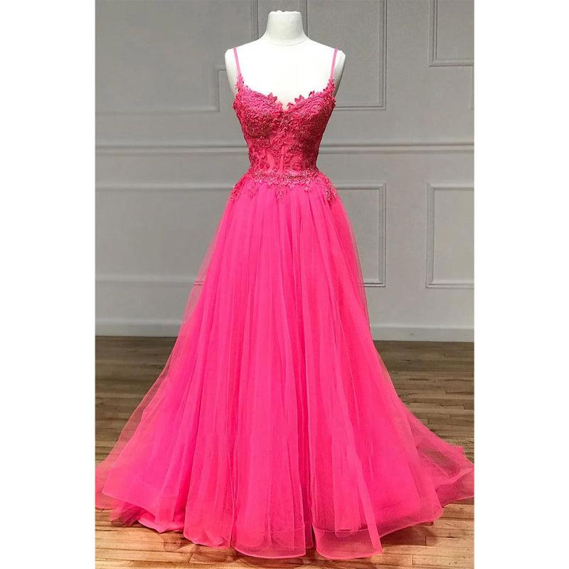 Robe de bal longue trapèze à bretelles spaghetti et appliques en dentelle