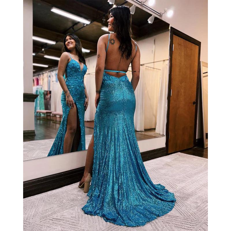 Robe de bal longue à bretelles spaghetti et paillettes orange avec fente