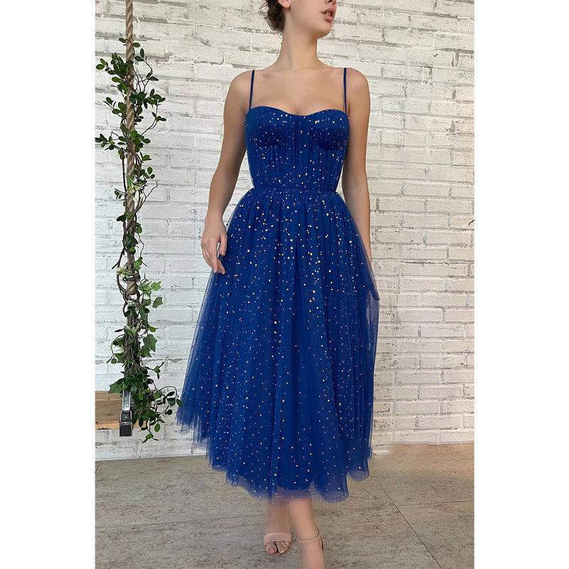 Robe de bal scintillante en tulle étoilé à bretelles spaghetti et poches