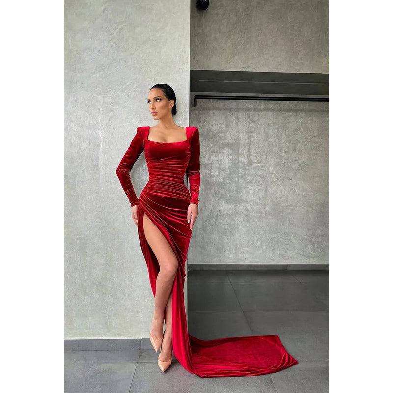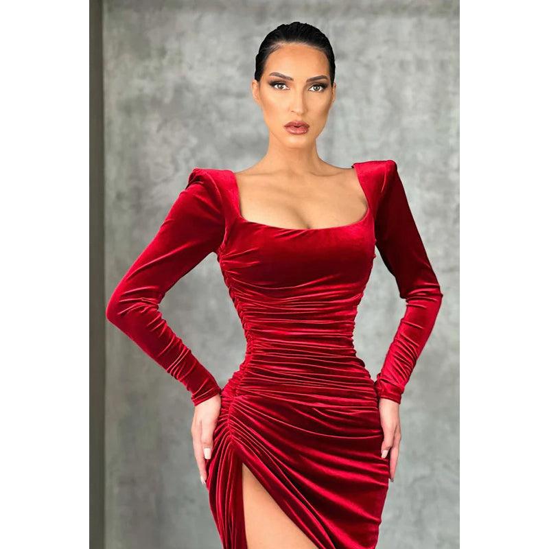 Robe de soirée fourreau en velours froncé à manches longues et col carré