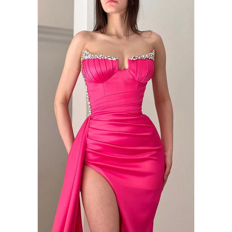 Robe de bal longue en satin froncé, bustier, perles et fente