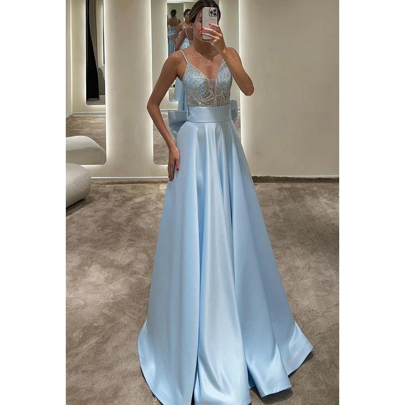 Robe de soirée longue trapèze en satin à paillettes et bretelles spaghetti à col en V