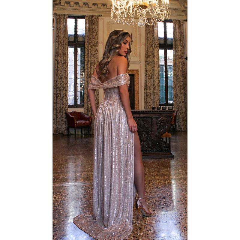 Robe de bal longue sans bretelles à plis et fente haute scintillante