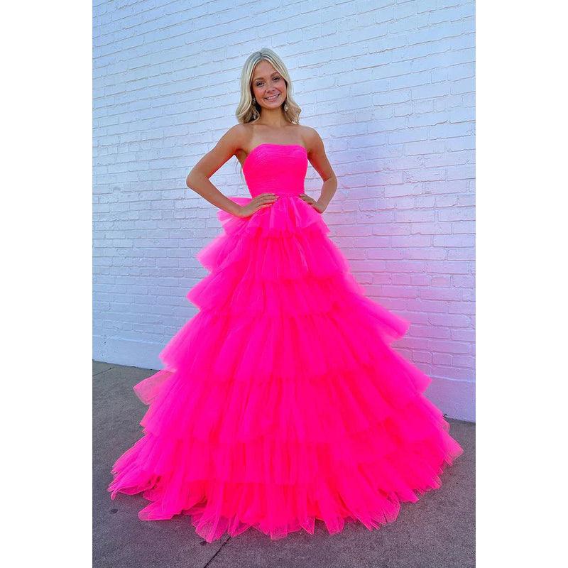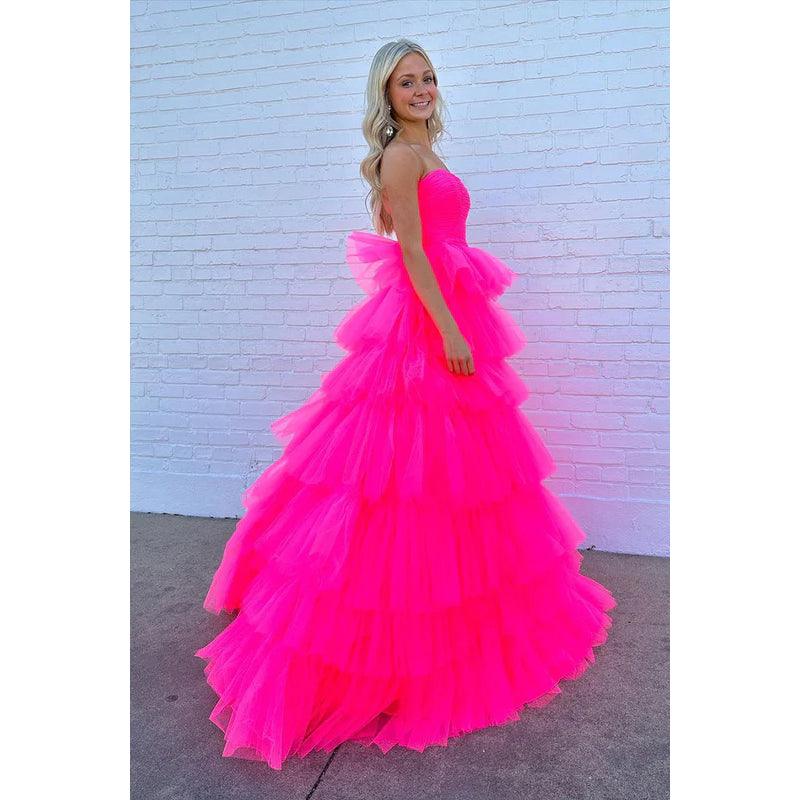 Robe de bal longue en tulle rose vif sans bretelles