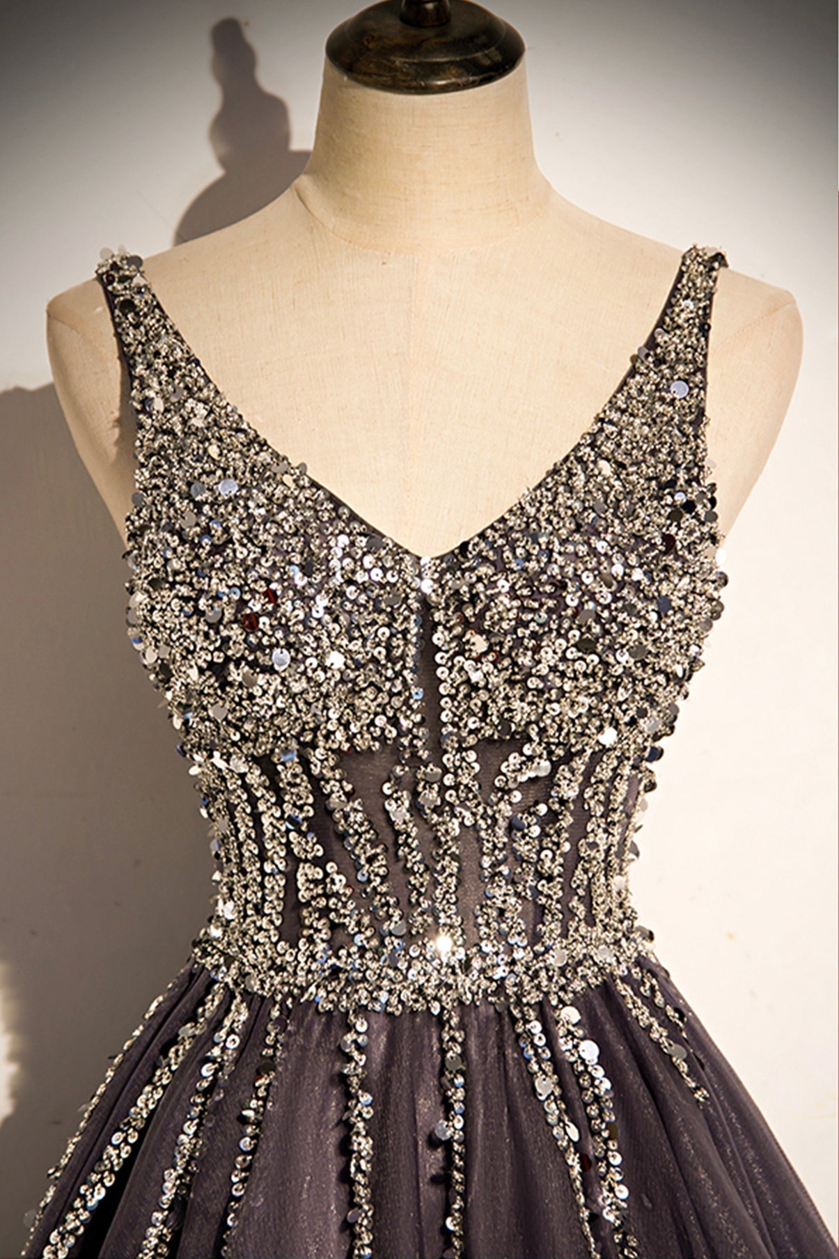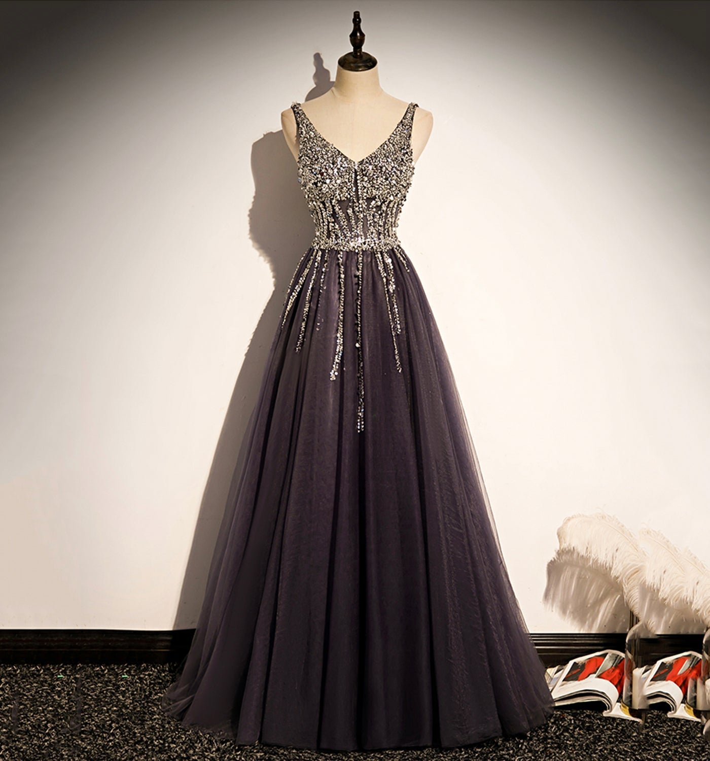 Robe de bal longue en tulle à col en V élégante, robe de soirée trapèze s76