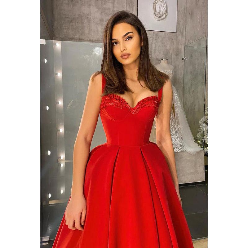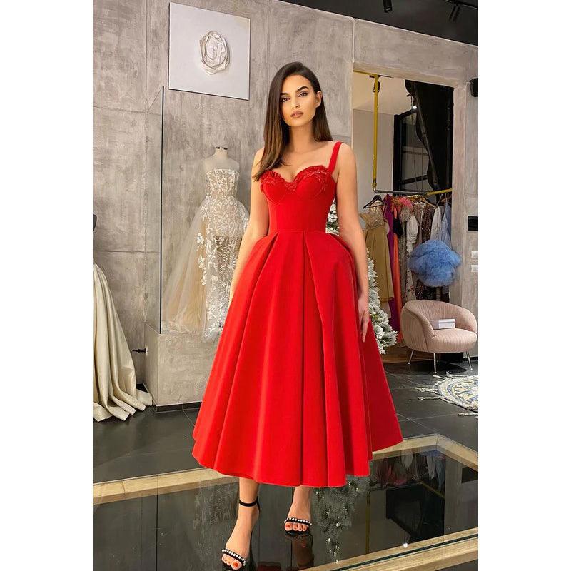 Robe de soirée mi-longue en satin à volants et décolleté en cœur