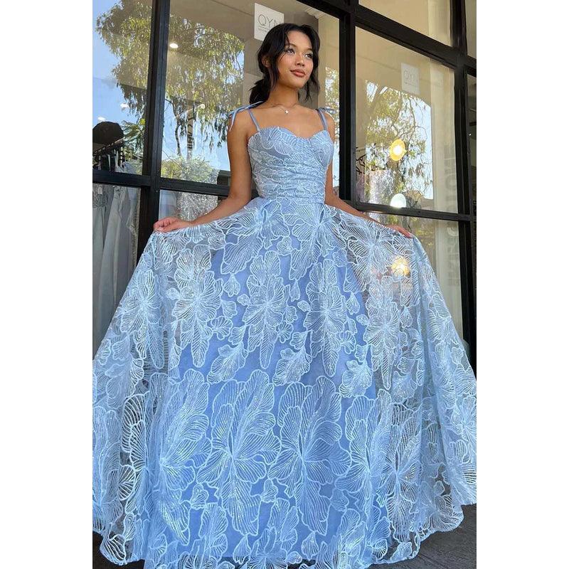 Robe de bal longue trapèze en dentelle à bretelles spaghetti et décolleté en cœur