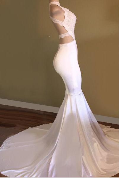 Saison : Été Encolure : Col montant Matière : Satin extensible. Dentelle Silhouette : Sirène Style : Chic Morphologie : Femmes Train : Balayage / Brosse Longueur des manches : sans manches Ornement : Dentelle