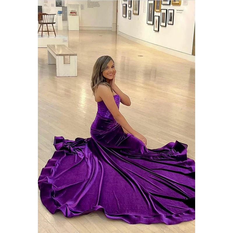 Robe de soirée sirène/trompette ornée, col en V, sans manches, fente latérale, appliques