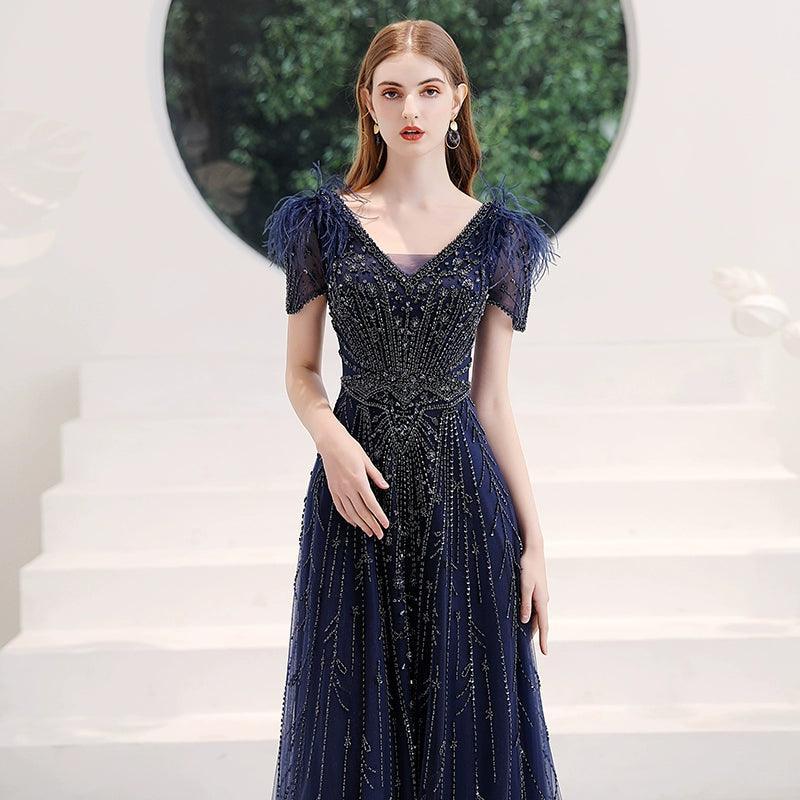Robe de soirée à col en V, robe de bal sexy, robe de soirée perlée pour femme