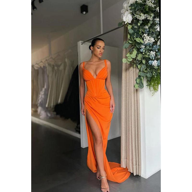 Robe de soirée longue en satin à col en V et fente sur la cuisse