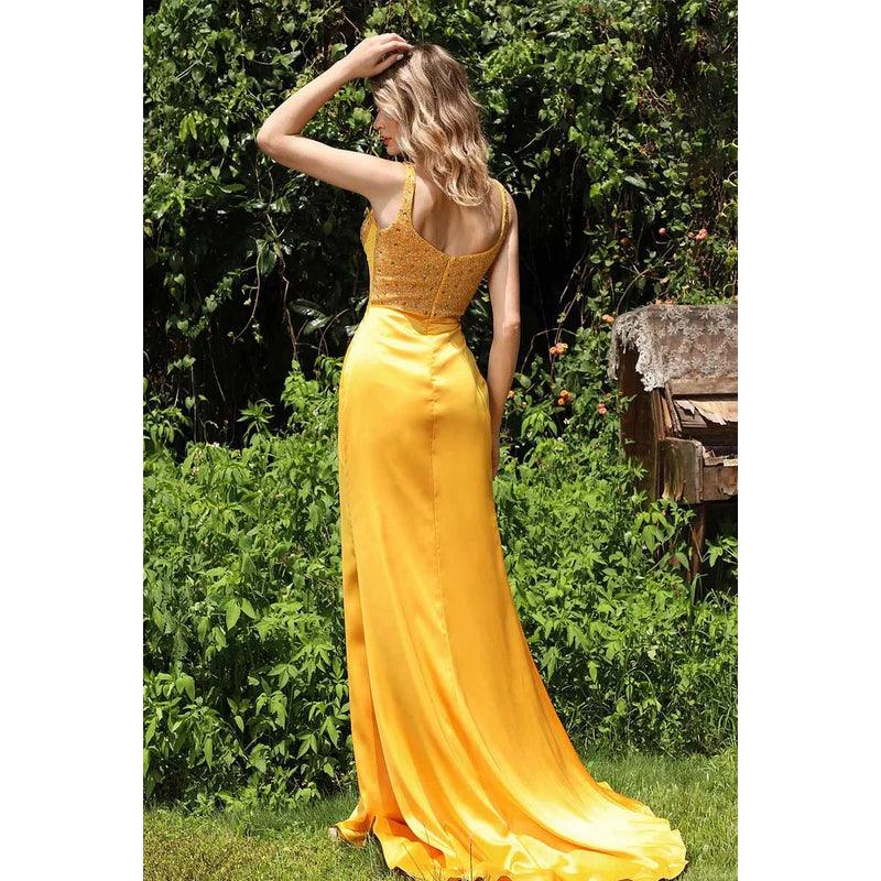 Robe de soirée longue fourreau à paillettes et perles, col en V, avec fente