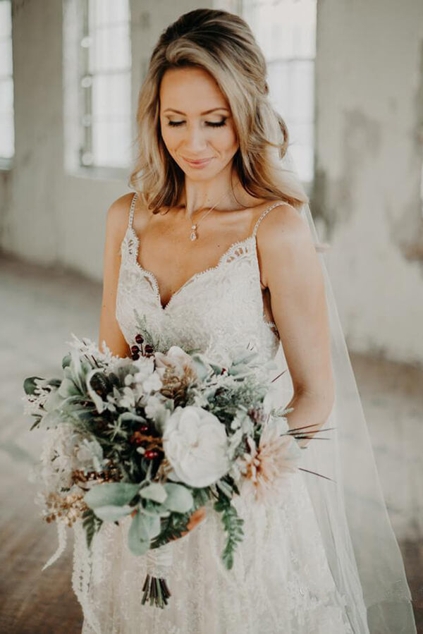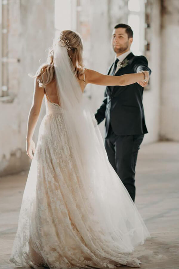 Robe de mariée vintage en dentelle, coupe trapèze, col en V, bretelles spaghetti et perles. MW582