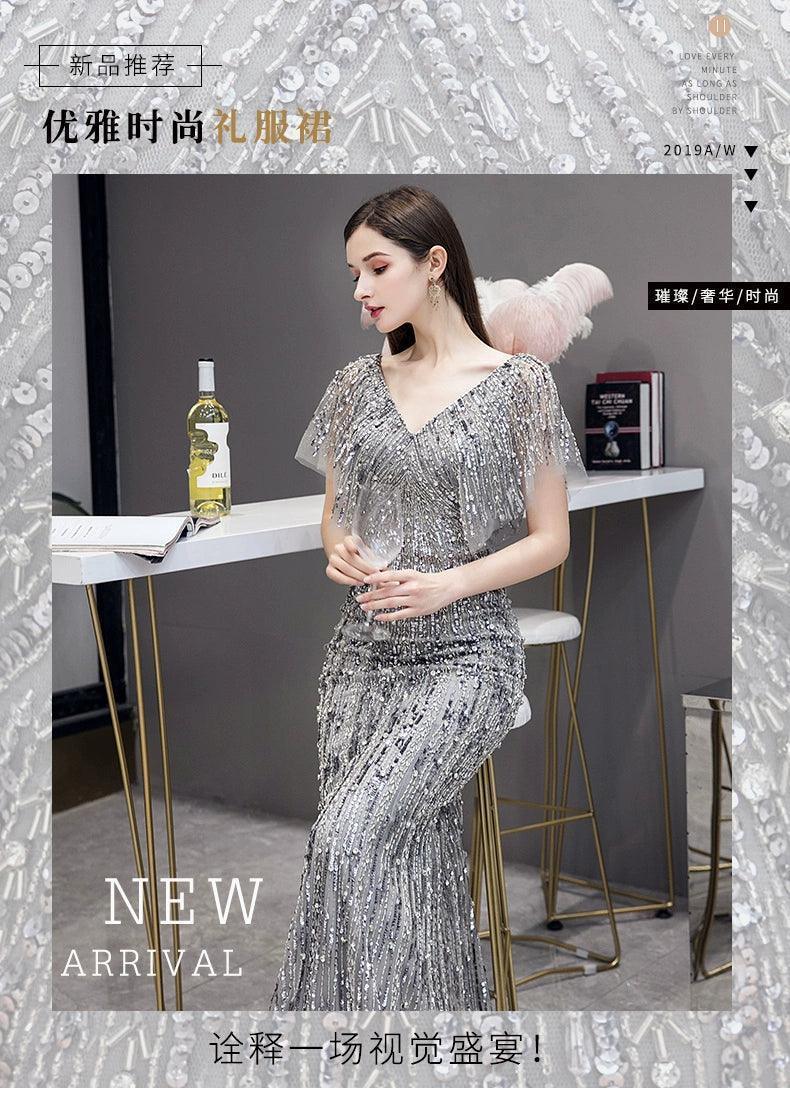 Robe de soirée sirène sexy pour femme, longue robe de soirée à col en V et perles