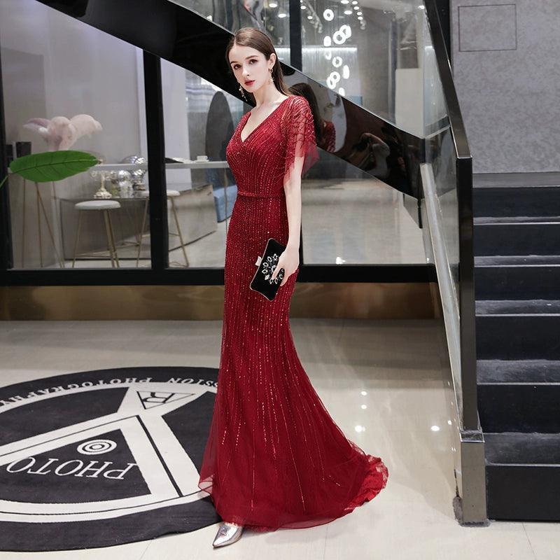 Robe de soirée sirène sexy pour femme, longue, col en V, robe de soirée perlée