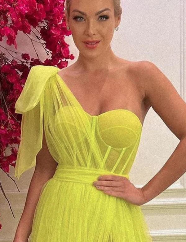Adoptez l'élégance et le charme de notre robe de bal jaune. Son design asymétrique unique et sa fente haute sexy lui confèrent une allure luxueuse. Sa jupe fluide en tulle superposé lui confère une silhouette élégante et longue. Son design sans manches lui confère une allure moderne.