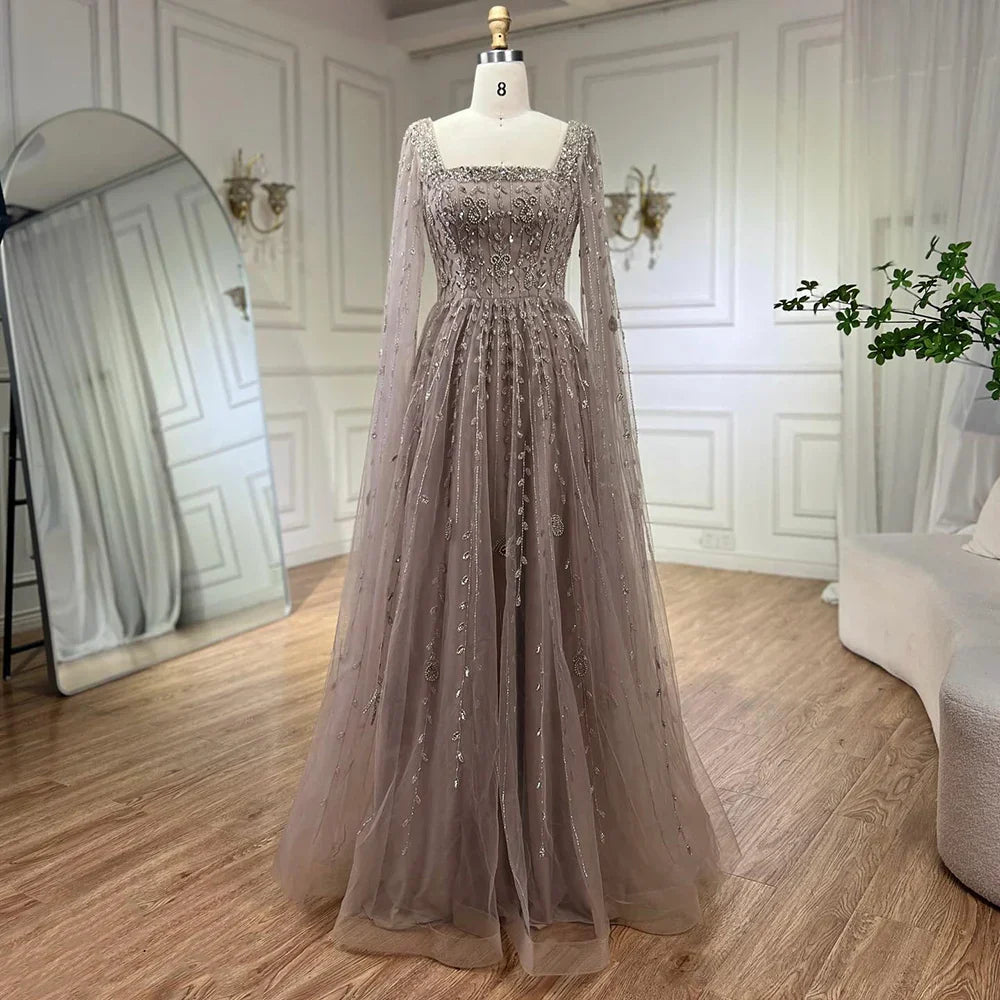 Muslim Caramel Beaded A-Line Luxury Evening Dress Gown with Cape Sleeves LA71803A