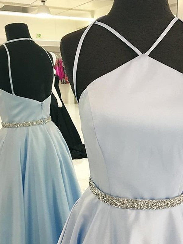 A-Line/Elegant Halter Sleeveless Floor-Length Satin Prom Dresses