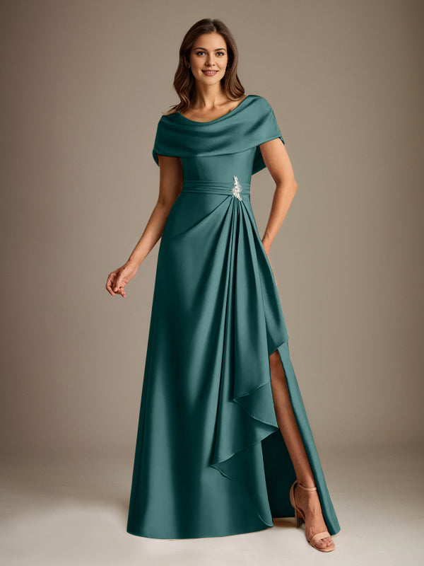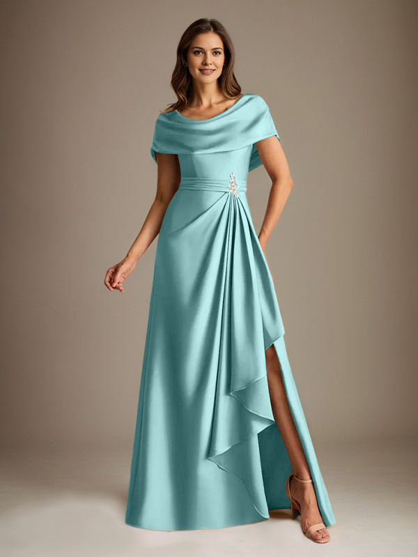 A-Line Scoop Floor-Length Stretch Satin Mother of the Bride Dress With Cascading Ruffles