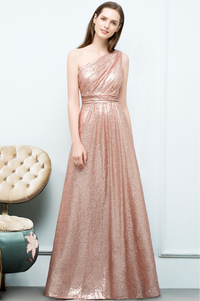 A-line Sleeveless Floor Length One-shoulder Sequins Prom Dresses