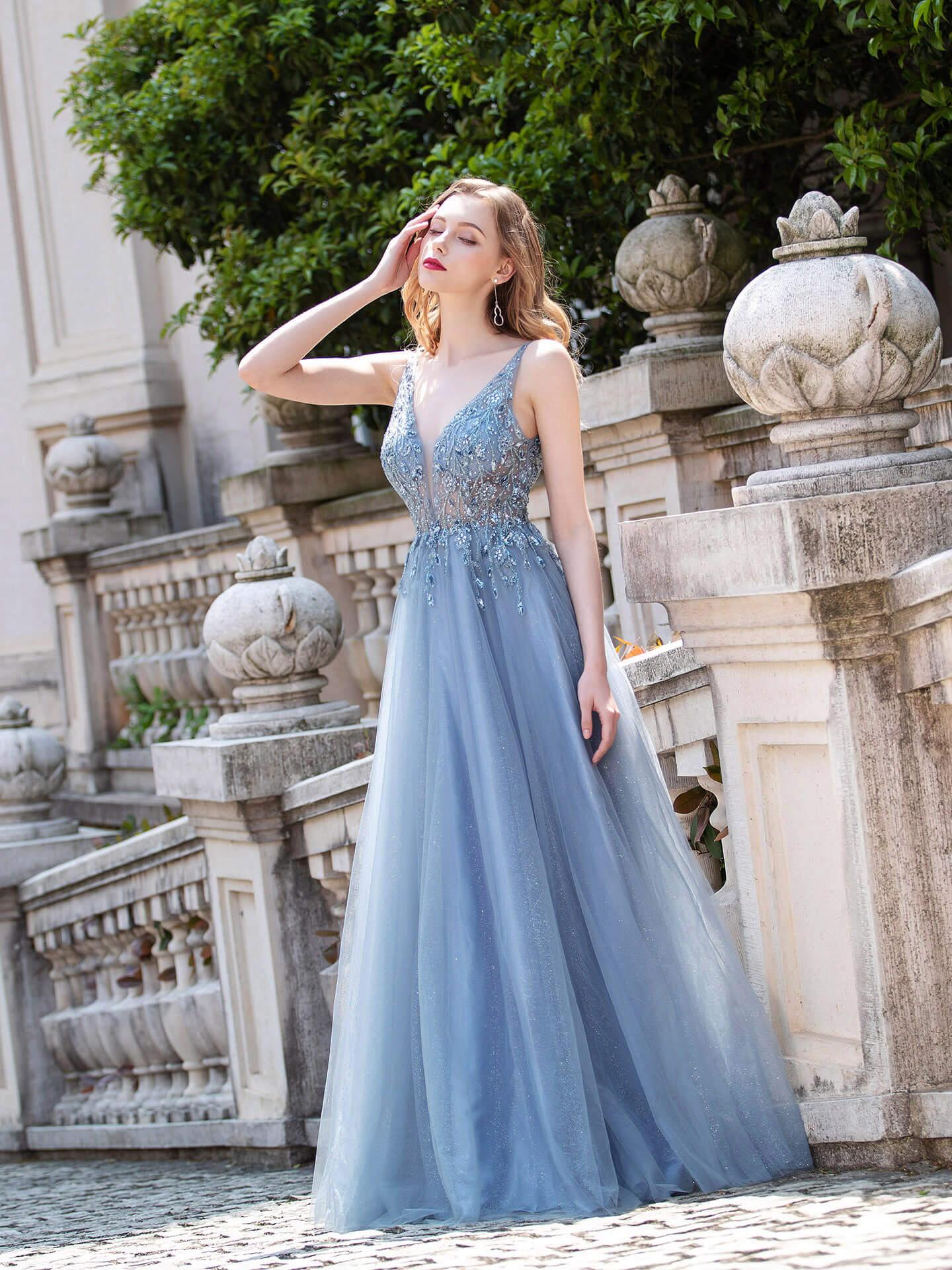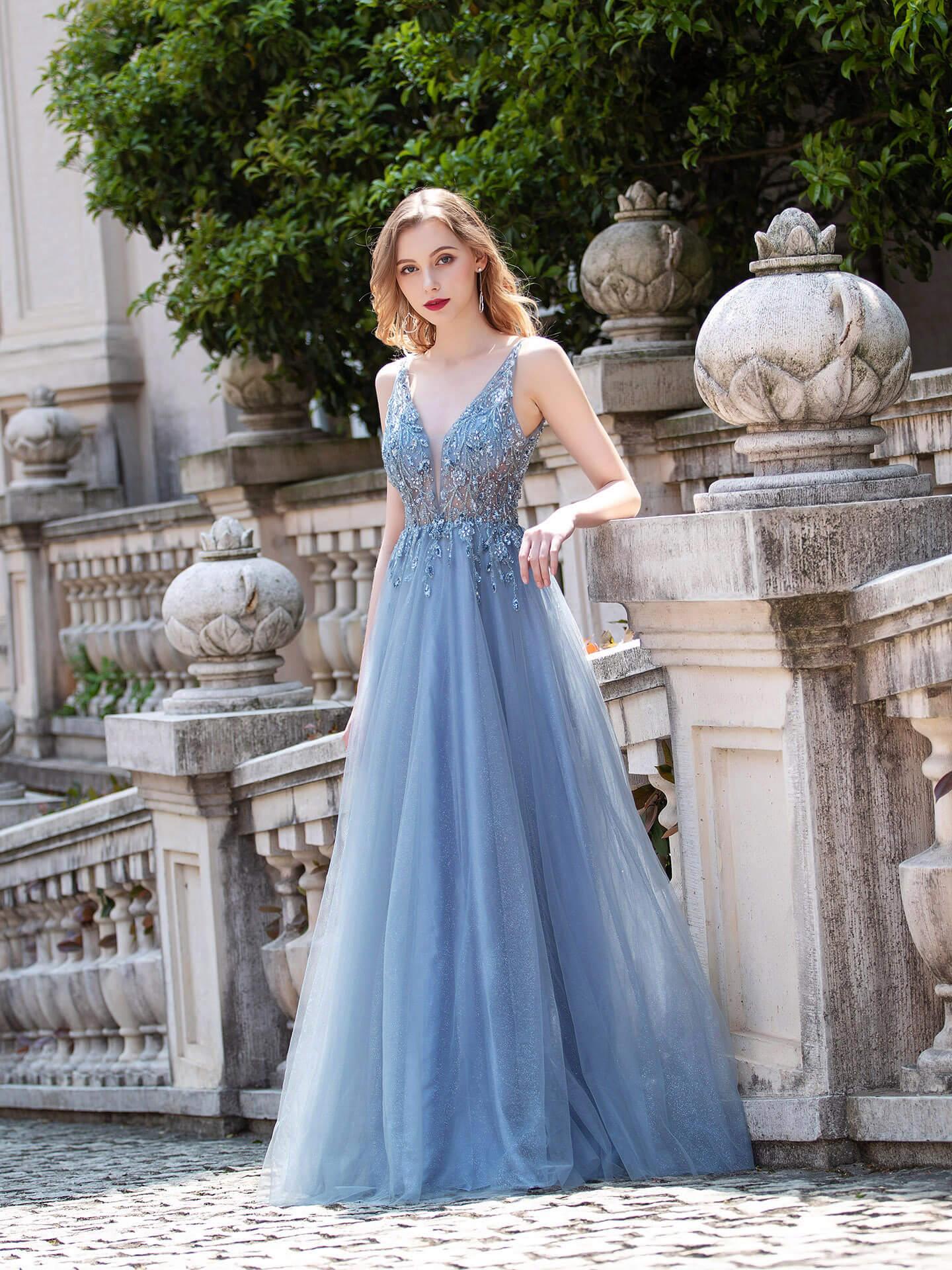 Baoleely A-line Tulle V-neck Luxurious Sexy Formal Evening Dresses Sleeveless Floor Length
