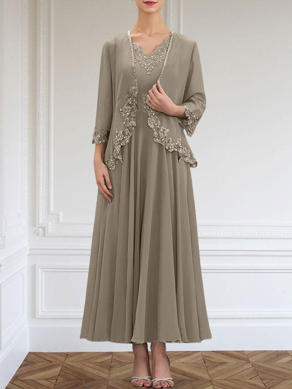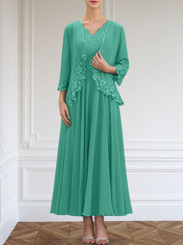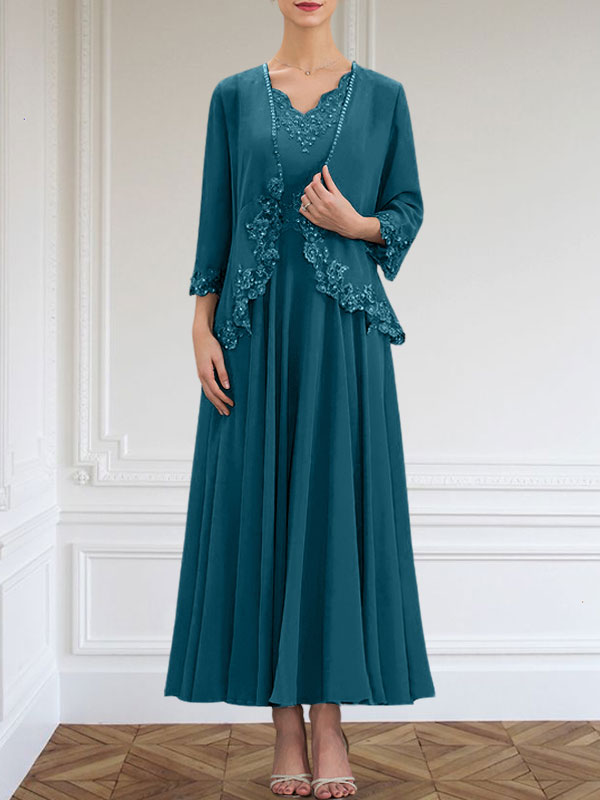 A-line V-Neck Ankle-Length Chiffon Mother of the Bride Dress With Sequins Appliques Lace Beading