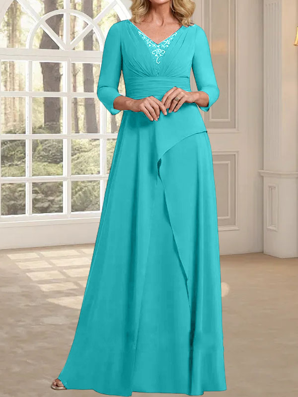 A-line V-Neck Floor-Length Chiffon Mother of the Bride Dress With Pleated Beading
