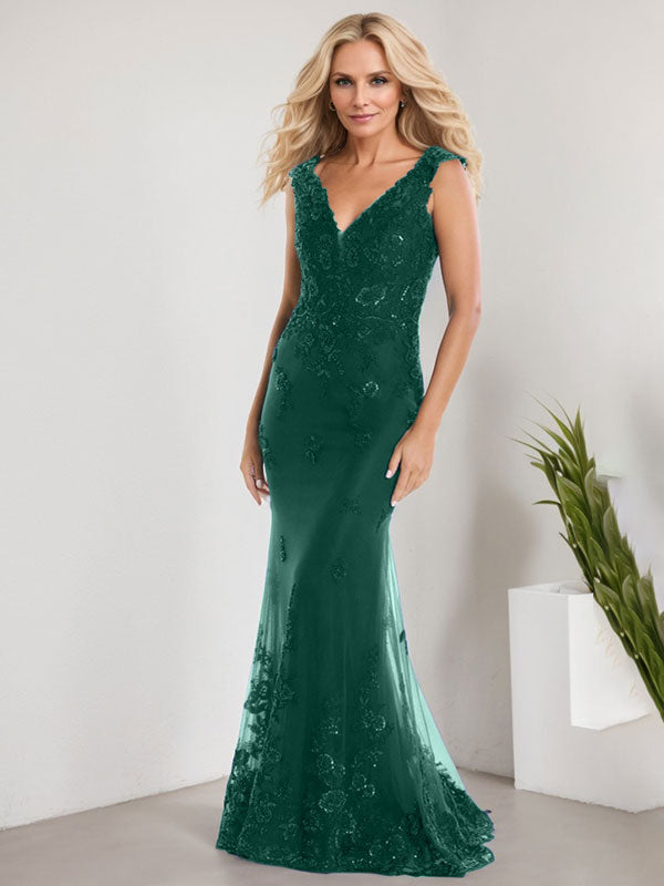 A-line V-Neck Floor-Length Lace Chiffon Mother of the Bride Dress With Applique Sequins Mermaid Dresses