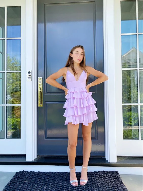 A-line V Neck Light Lavender Short Homecoming Dress Layered Cute Homecoming Dress Y2721