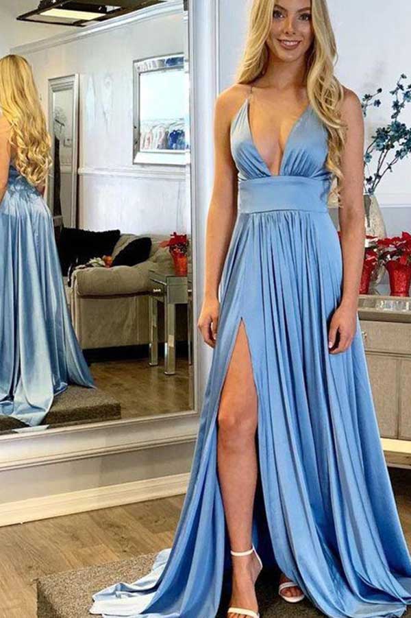 A-line V-neck Spaghetti Straps Blue Satin Long Prom Dresses. Split Evening Party Dresses.MP547