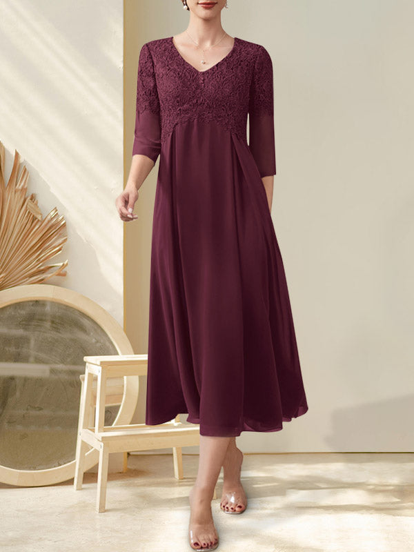 A-line V-Neck Tea-Length Chiffon Lace Mother of the Bride Dress With Beading