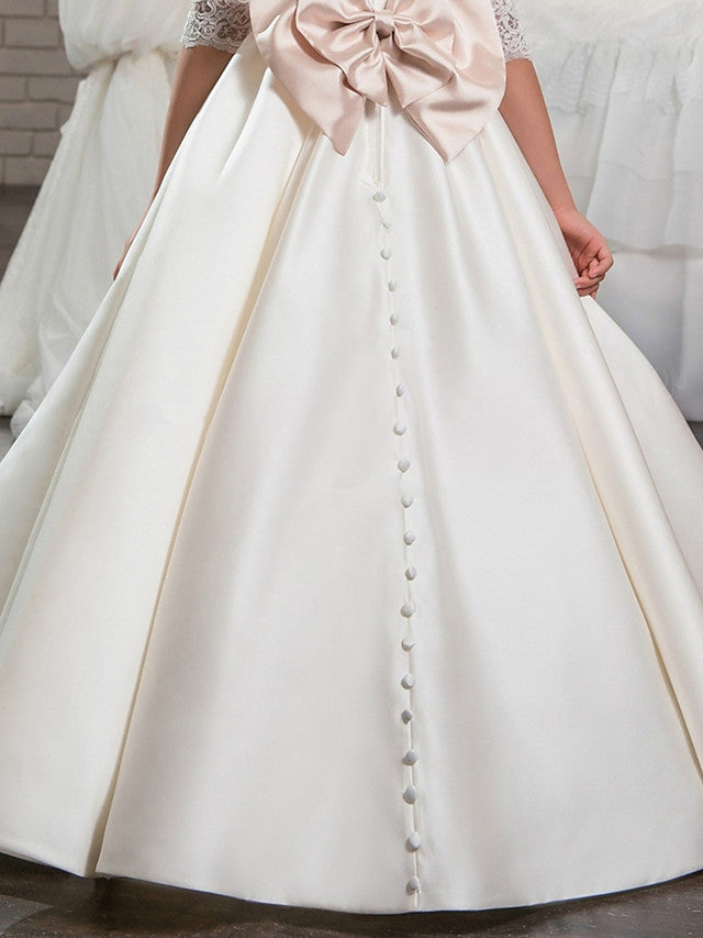 Ball Gown Lace Satin Sweep Brush Train Wedding Birthday Pageant Flower Girl Dresses with Sleeves
