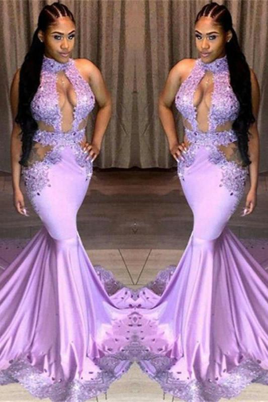 Back Details: Backless Neckline: High Neck Material: Stretch Satin Silhouette: Mermaid Body Shape: Plus Train: Court Train Sleeve Length: Sleeveless Hemline: Floor-length Embellishment: Lace. Beading. Appliques