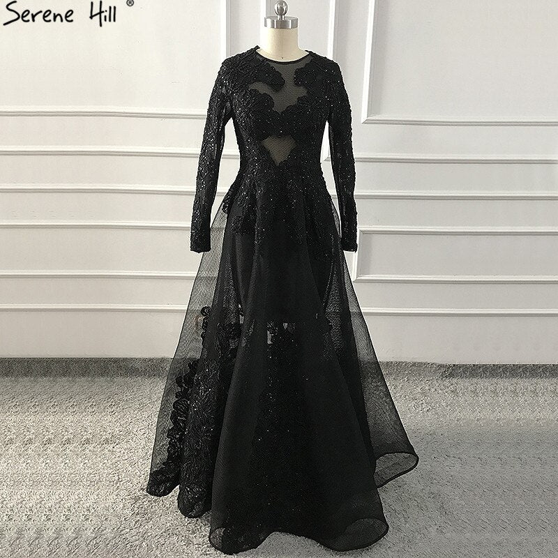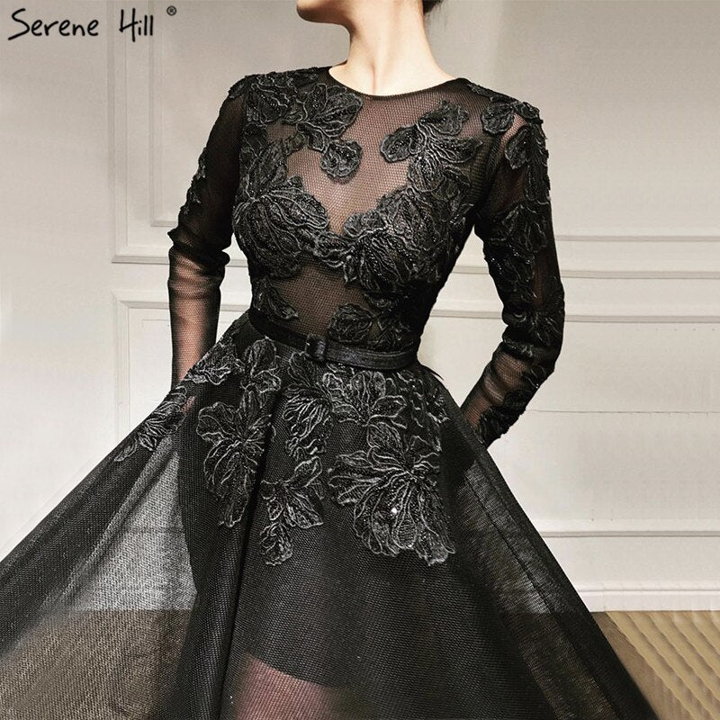 Black O-Neck Handmade Flowers Evening Dresses 2025 Long Sleeves Perspective Sexy Evening Gowns LA60837