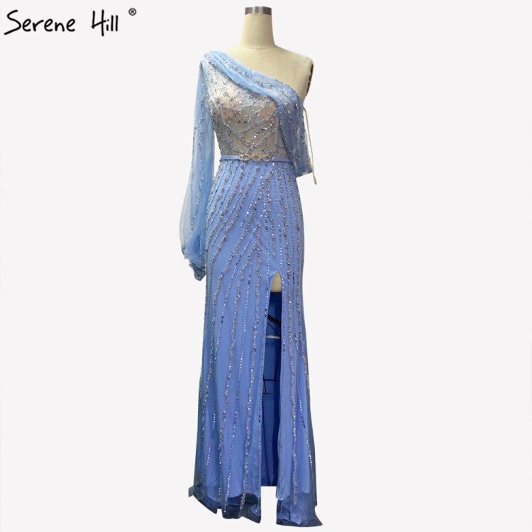 Blue Dubai One Shoulder Sexy Split Evening Dresses Luxury Beaded Crystal Sparkle Formal 2025 LA70258