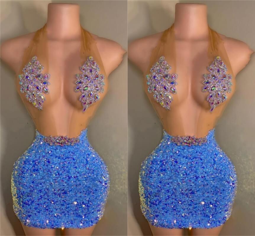 Blue Halter Sleeveless Short Prom Dresses With Sequins Beads