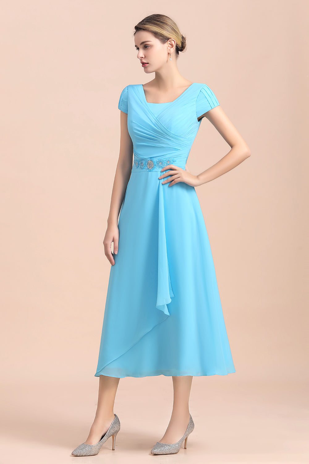 Blue Short Sleeves Chiffon Mother of the Bride Dress Tea-Length Online