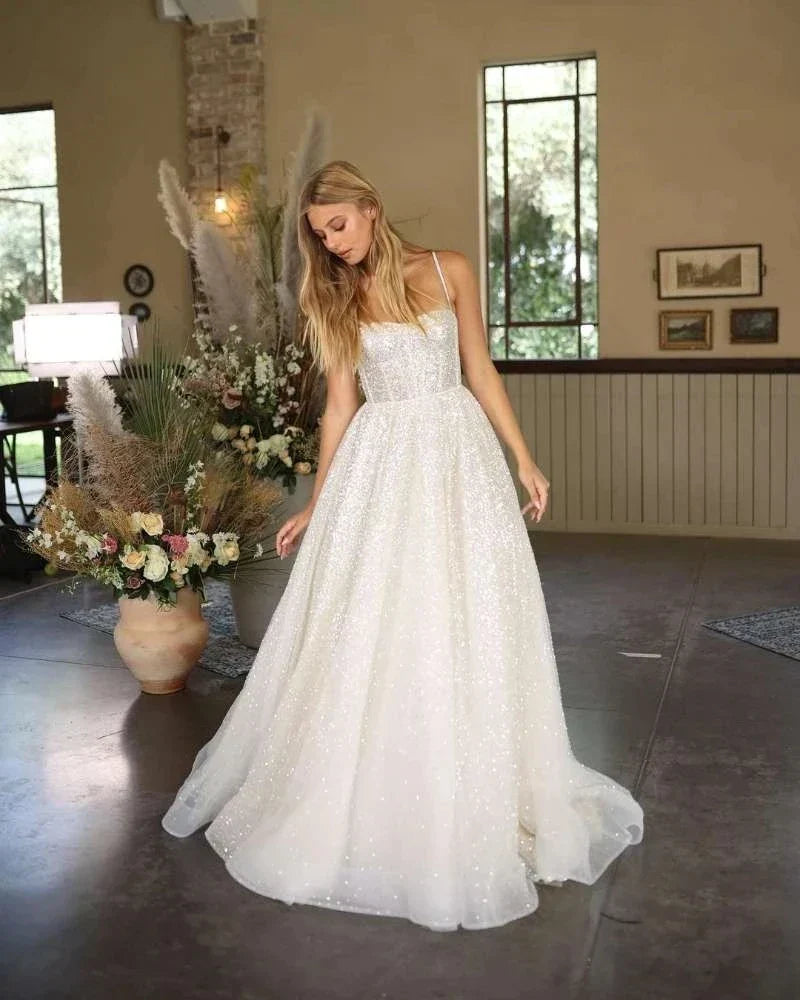 Bohemian Wedding Gowns A-Line Women's Sweetheart Bridal Dresses Sexy Sleeveless Sparkling Tulle Robe Vestidos Fiesta فستان